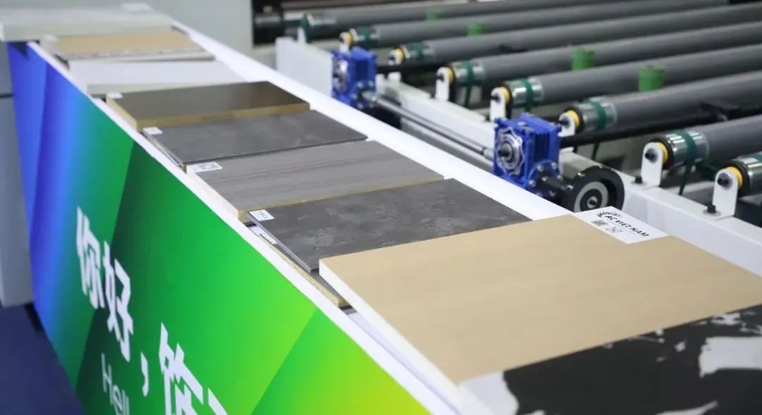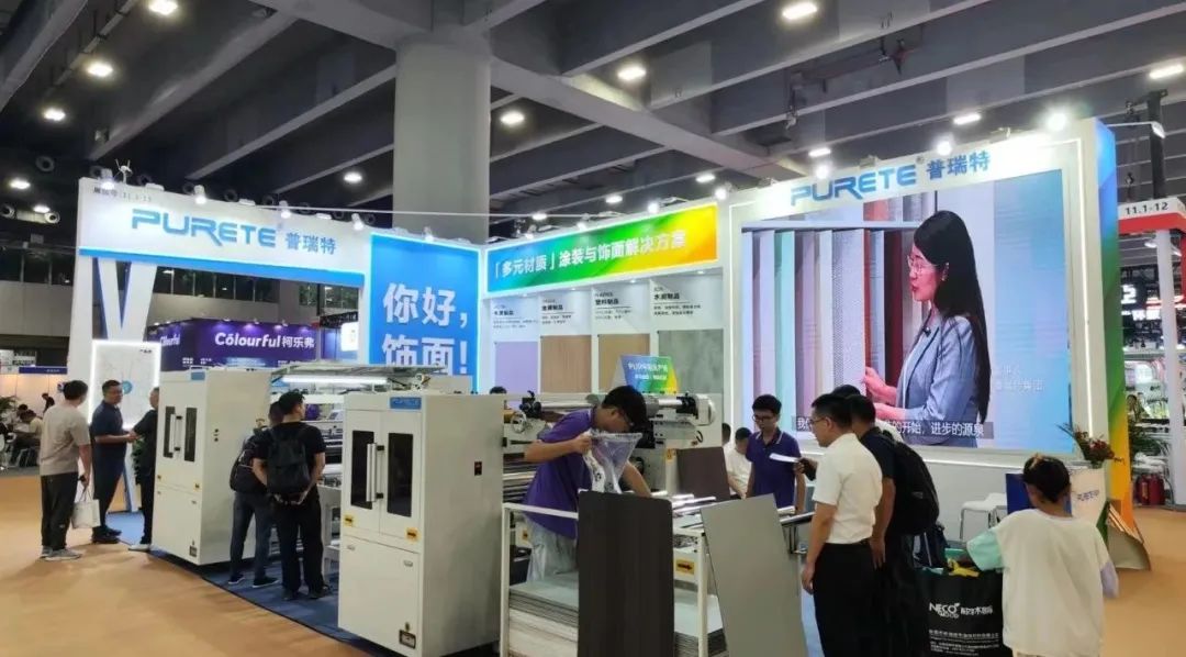 展會現(xiàn)場展示PUR平貼線。有SPC、碳晶板、歐松板等多種基材,現(xiàn)場演示EB膜、PVC仿生膜、PVC木紋膜等多種飾面膜的貼面效果。為客戶提供個性化,六面一體的多元材質(zhì)空間,涂裝與飾面解決方案。